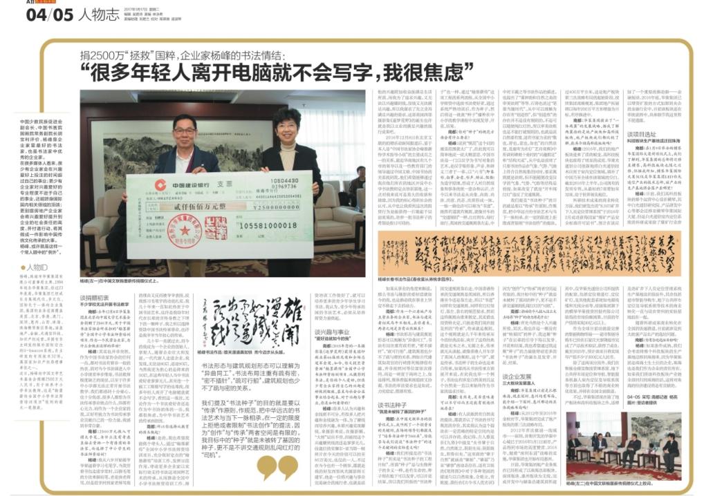 近日,楊峰向中國(guó)文學(xué)藝術(shù)基金會(huì)捐贈(zèng)2500萬(wàn)元人民幣,用于培養(yǎng)中小學(xué)書(shū)法教師,這是“翰墨薪傳全國(guó)中小學(xué)書(shū)法師資培訓(xùn)項(xiàng)目”收到的最大一筆捐款。