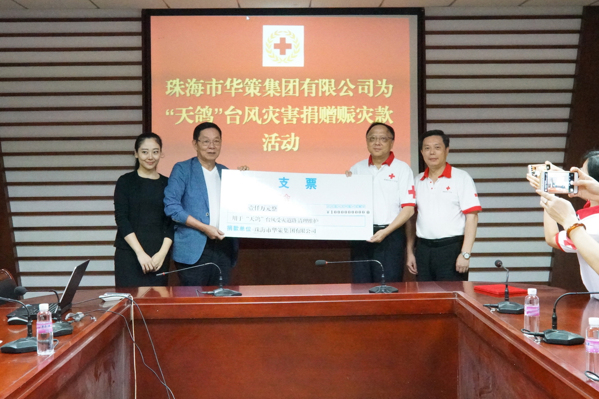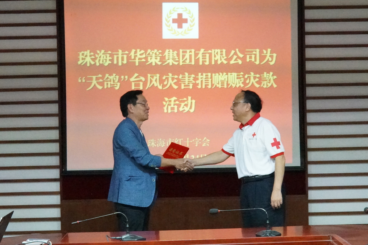 8月24日下午,珠海市華策集團有限公司(以下簡稱“華策集團”)向珠海市紅十字會為“天鴿”強臺風災害捐款1000萬元。市政府副市長、市紅十字會長閻武代表市紅十字會接受了捐贈。此次捐款是我市目前行動最快,金額最大的捐贈。